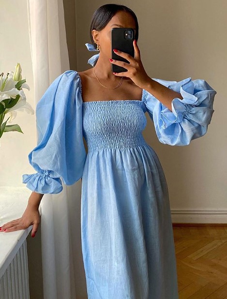 Entre os modelos de vestidos com manga bufante, o mais desejado foi aquele com modelagem bem soltinha, decote quadrado, lastex no peito e manga bem fluffy.