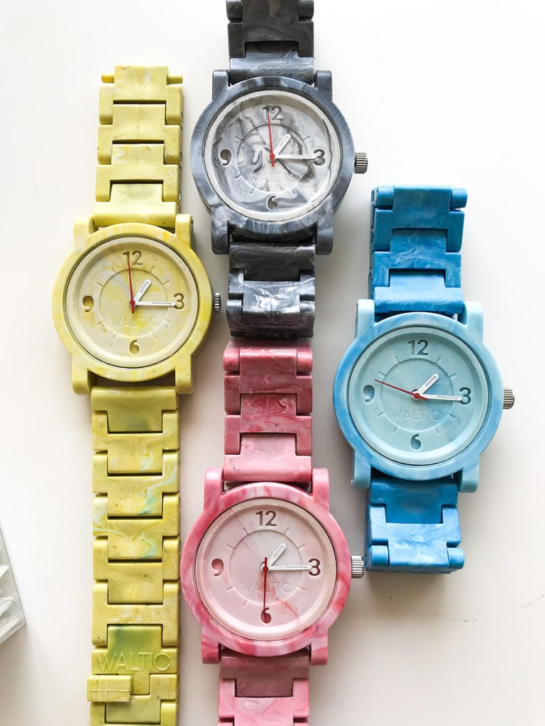 As máquinas e as técnicas utilizadas dão um efeito incrível de mármore, desta forma cada peça é única. Todos os componentes do relógio são montados sem cola e injetados em moldes. Este é o primeiro relógio de pulso feito de sacolas plásticas recicladas, seu invólucro é 100% de PEBD.