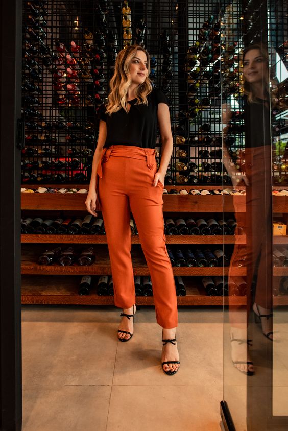 Se você não gosta muito de laranja, pode compor um look onde as cores das peças combinem com acessórios cor de laranja, por exemplo. É uma maneira de usar a cor discretamente.