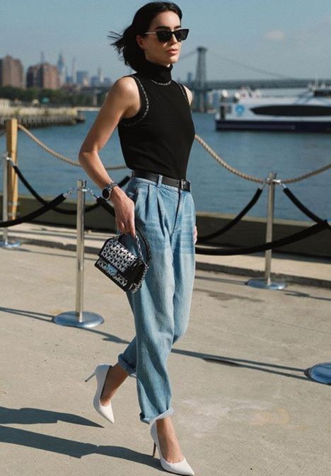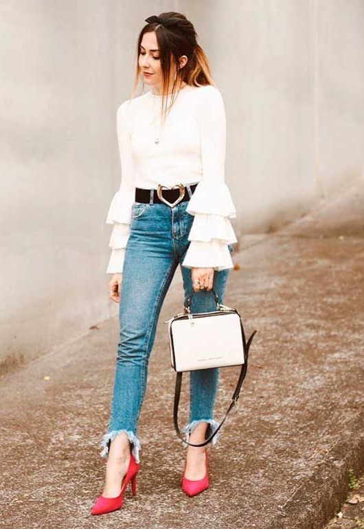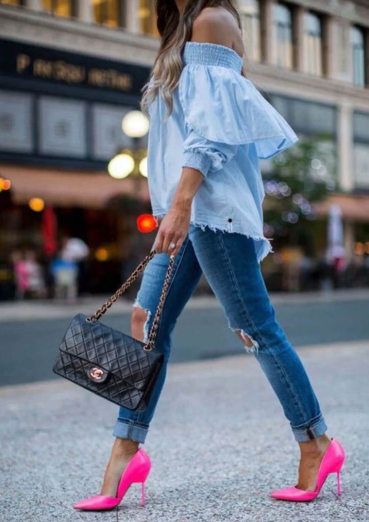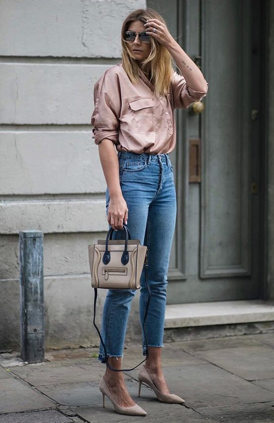 Esse match jeans + scarpin representa o hi-lo, é ideal pra usar no dia a dia e dá um UP no look. Dá pra ver muita produção desse match no street style, principalmente de fora.