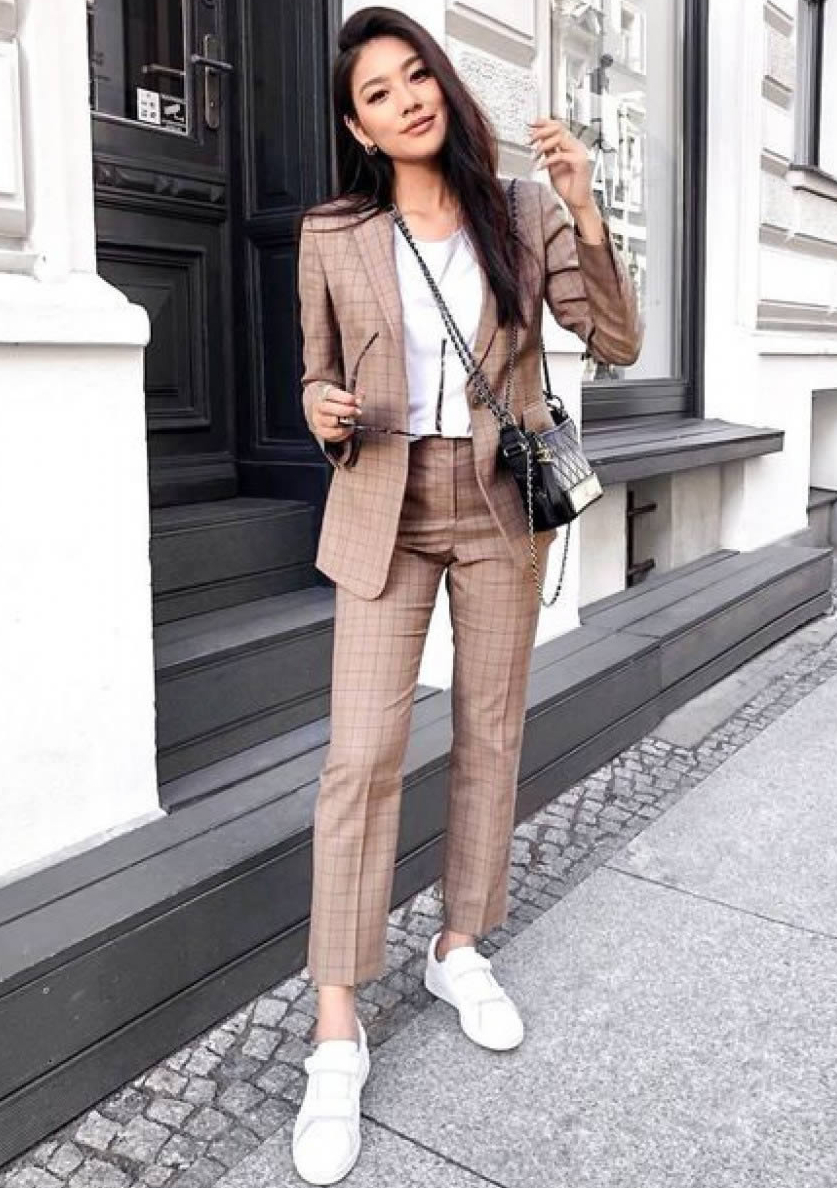 É mais fácil optar por usar a parte de cima com branco, por exemplo uma camiseta ou camisa branca. Ou, ainda, combinar com acessórios brancos, como um cinto ou bolsa branca. A ideia é ter dois pontos de cor branca, fica mais equilibrado.