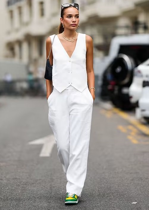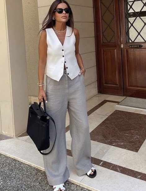A alfaiataria cool é mais despojada e moderna, não precisa ter aquela cara de escritório. Pelo contrário, é pra ser usada em qualquer momento, com tênis ou rasteiras. Bem despojada! A peça HIT do verão europeu foi o coletinho de alfaiataria, só deu ele, super em alta.