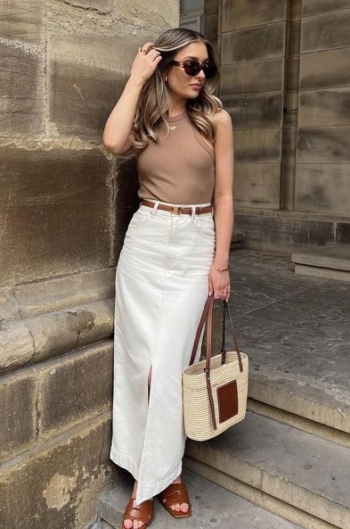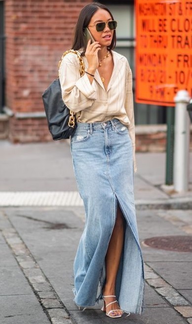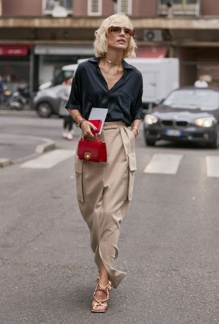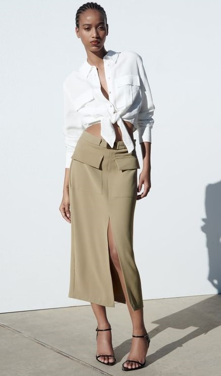 A saia jeans com fenda também foi preferência das fashionistas da Europa. Tanto que chegou ainda no nosso inverno (onde usamos com bota). A saia cargo é uma novidade que ainda está fresquinha. No verão daqui, você vai ver muito desses 2 modelos, super modernos.