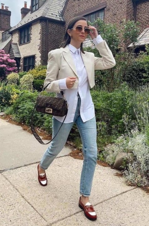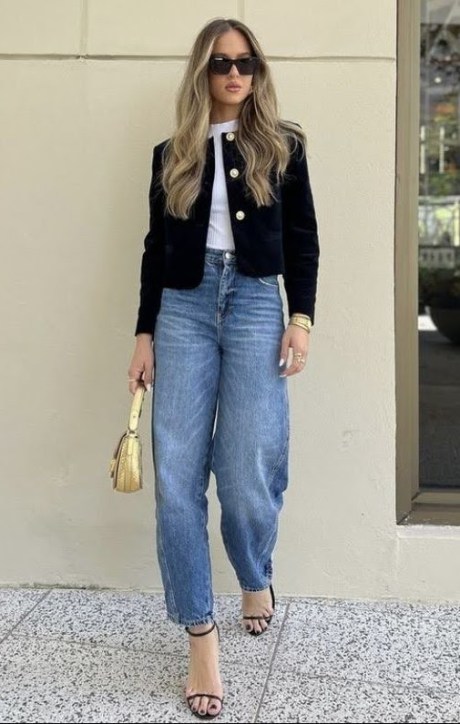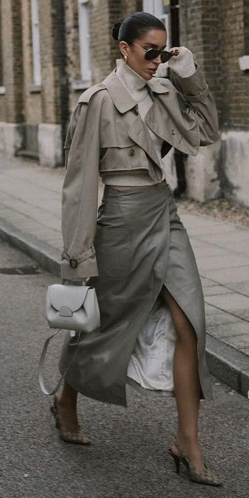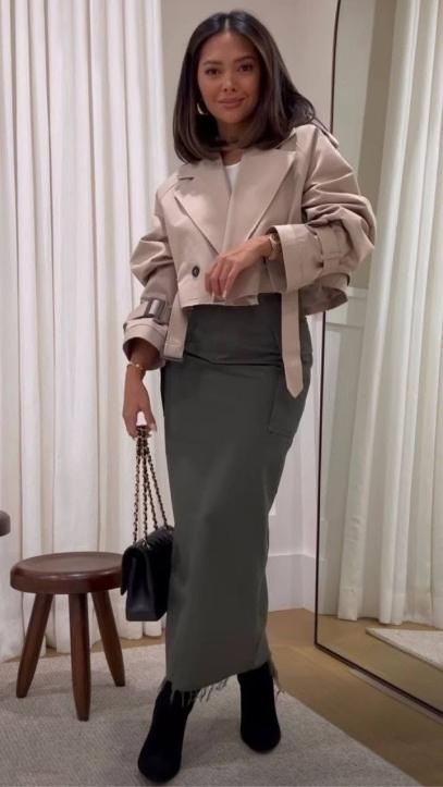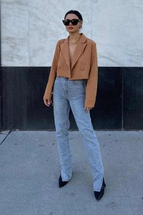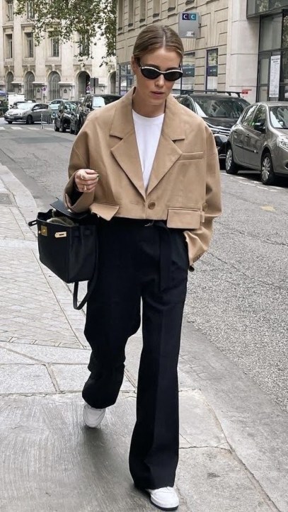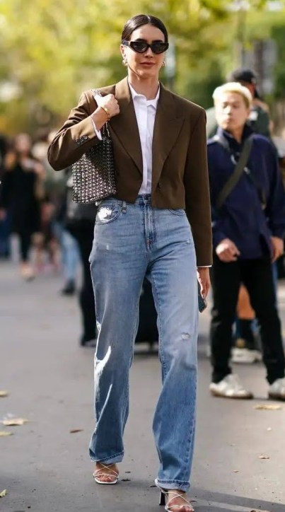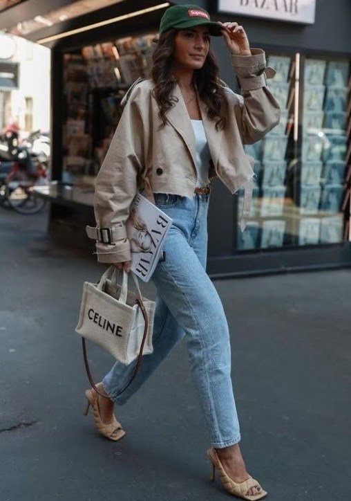 O que mais temos visto é o blazer cropped, mas além dele também podemos ver o trench coat e as jaquetinhas, no mesmo estilo cropped.