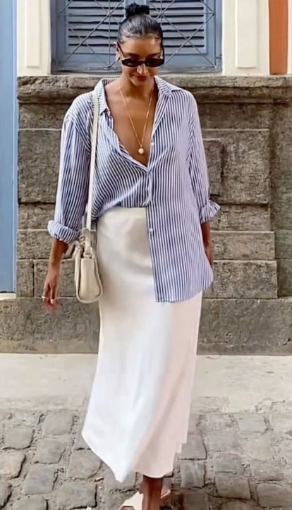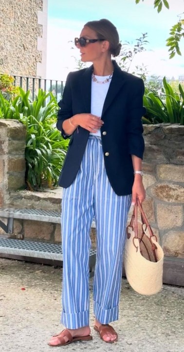 Mas também dá pra criar looks mais sofisticados, misturando as listras com peças de alfaiataria e saias midi, por exemplo.