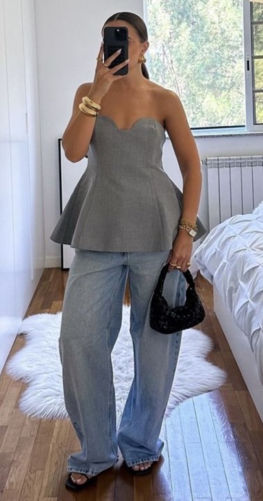 O peplum já esteve em alta, em diferentes épocas da nossa história da moda, agora vem repaginado. Está um pouco mais discreto e tem uma nova versão, com menos volume. Em um estilo alfaiataria, com um conjunto monocromático e calça reta, o peplum fica mais elegante.