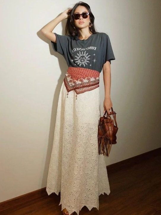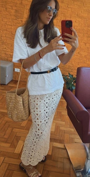 Os modelos são variados, mas as favoritas das fashionistas são as saias boho, de renda e de crochê, em um estilo hand made; a balonê e a jeans; as saias em seda ou cetim, que também continuam em alta.