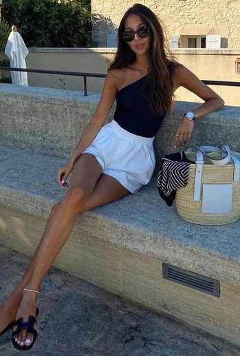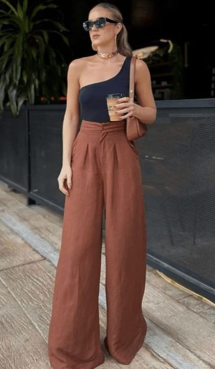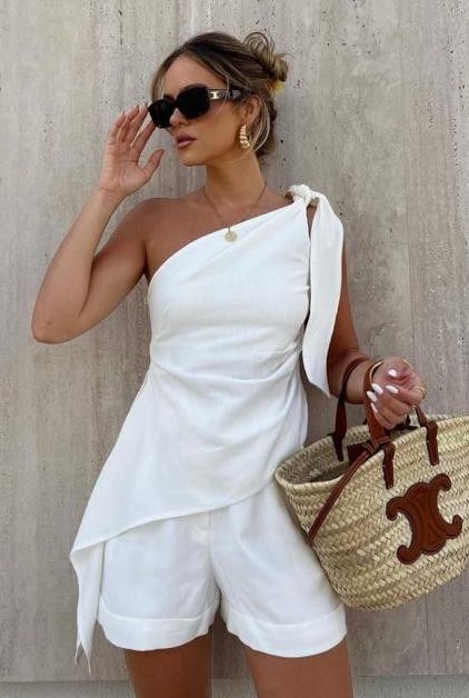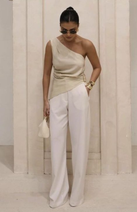 A blusa de um ombro já é, por si só, a estrela do look. Seu charme está na assimetria, que cria uma linha visual, alongando a silhueta e deixando-a mais chique.